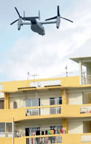 (浦添市のマンション上空を合意違反のヘリモードで飛行するMV22オスプレイ 2012年10月15日午後3時16分、浦添市民球場から撮影) 米軍普天間飛行場に強行配備された米海兵隊の垂直離着陸輸送機MV22オスプレイは2012年11月1日で、…