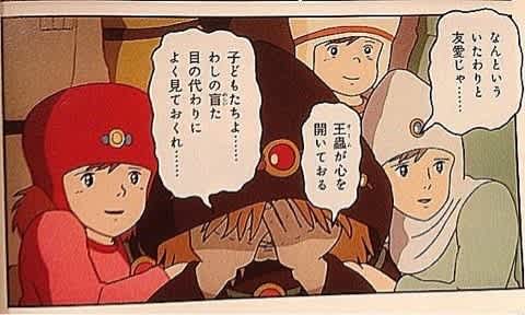 「奇跡じゃ、奇跡じゃ!なんといういたわりと友愛じゃ。王蟲が心を開いておる。子どもたちよ、わしの盲いた目の代わりによく見ておくれ」