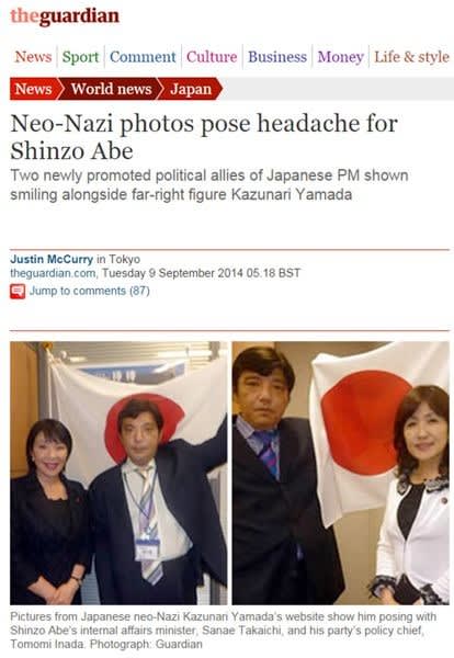 タイムスと並ぶ高級紙ガーディアンも、高市氏と稲田朋美氏という安倍晋三氏のお気に入りが日本のネオナチツーショットの写真を撮っている!と報道したくらいです。