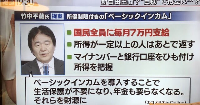 竹中氏は2020年9月23日にテレビでベーシックインカム論を開陳。