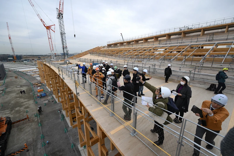 再来年の大阪・関西万博で、会場のシンボルとして設けられるリング型の木造建築物「大屋根」の工事の様子が、27日、報道陣向けに公開されました。