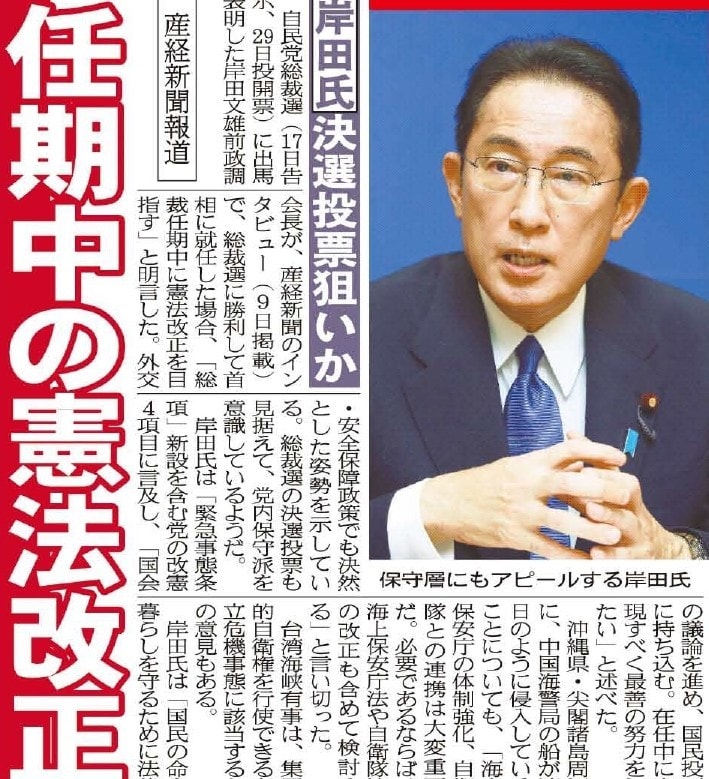 改憲を求める民間憲法臨調などが主催した「公開憲法フォーラム」には自民、公明、日本維新の会、国民民主の4党の議員が出席した。自民総裁の岸田文雄首相もビデオメッセージを寄せ、「社会が大きく変化する今だからこそ(改憲に)挑戦し続けなければならない」と強調した。古屋圭司憲法改正実現本部長は「改憲の必要性を必ず公約の大項目(重点項目)に入れて訴える」とアピールし、党の改憲案4項目(9条への自衛隊明記・大規模災害時の緊急事態条項・参院選の「合区」解消・国に教育環境整備の努力義務を課す「教育の充実」)を紹介した。