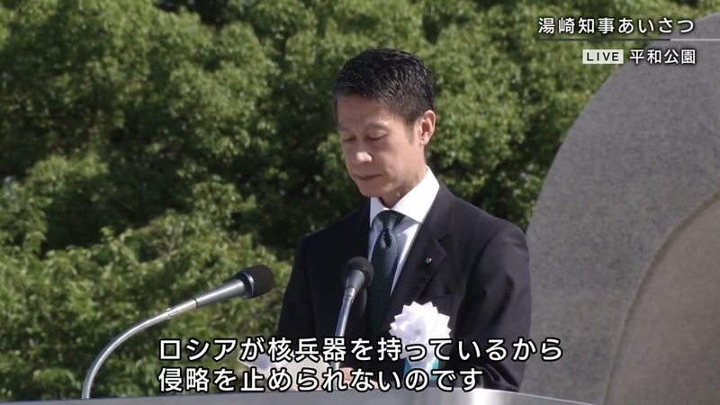 2023年の平和式典では、このように核の威嚇を続けるロシアのプーチン政権を名指しで批判した湯崎知事。