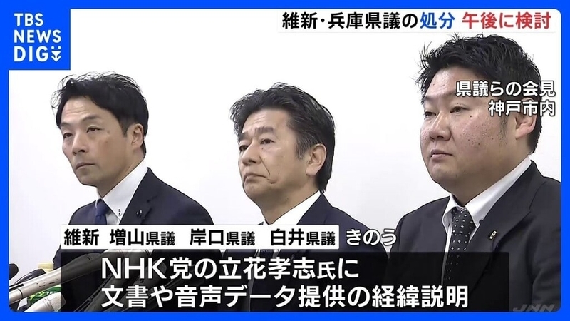 立花孝志氏に情報を流して竹内県議を自死に追いやった維新の会県議らが記者会見。維新創設者の橋下徹氏は兵庫維新の会解散で収めようとしているが、吉村洋文代表と斎藤知事は辞職、日本維新の会は解散するのが当然だ
