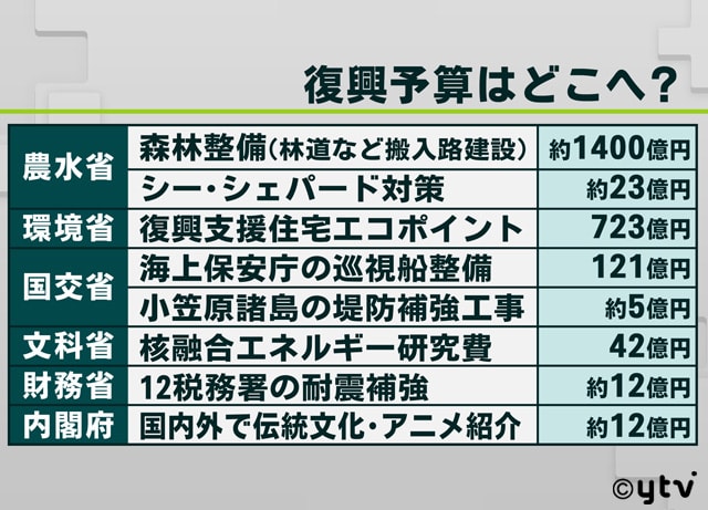 当然のことながら、復興予算は国民に負担を求める復興増税などで賄われているわけです。なのに復興予算が、目的を拡大解釈して被災地以外の事業で使われているわけです。